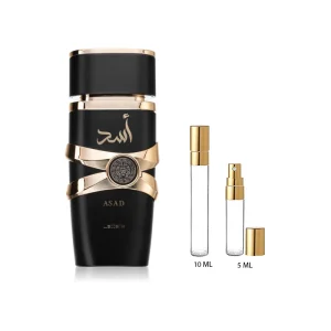 Lattafa Asad disponible en decants de 5 ml y 10 ml. Fragancia masculina intensa, especiada y elegante. Alternativa accesible a Dior Sauvage Elixir.