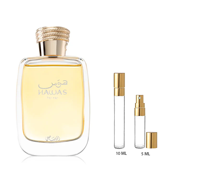 Decant Rasasi Hawas For Her es un perfume femenino floral dulce con notas frutales y praliné. Ideal para probar o uso diario.