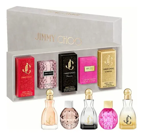 Kit Miniatura Jimmy Choo x5 para mujer. Incluye I Want Choo, Forever, Le Parfum, EDP y Rose Passion. Ideal para probar o regalar.